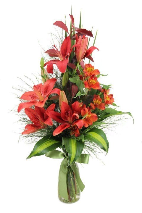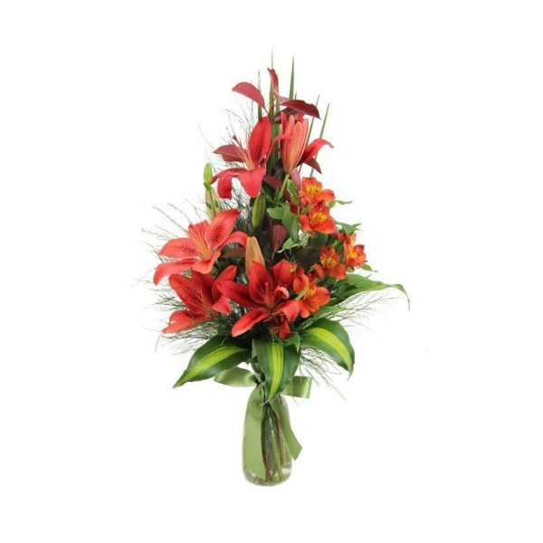 10455 – Bela opção de arranjo com lírios vermelhos e alstroemérias vermelhas em um vaso de vidro e laço de cetim.