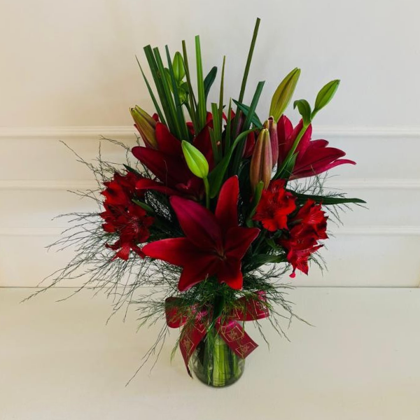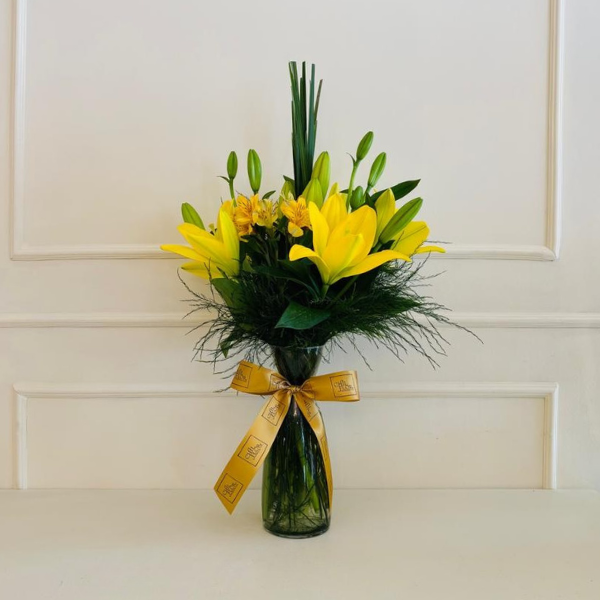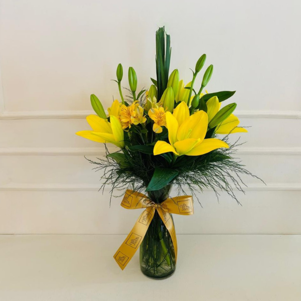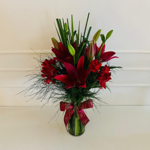 12364 – Bela opção de arranjo com lírios e alstroemérias em um vaso de vidro e laço de cetim.