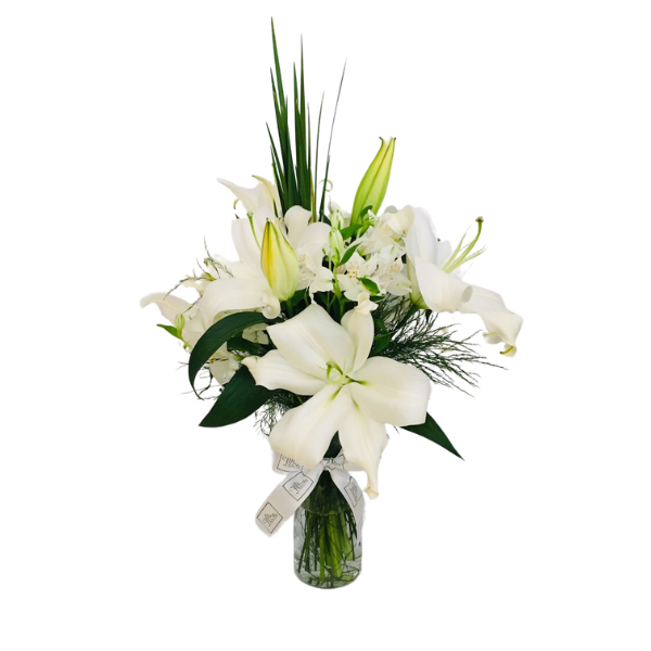 10552 – Arranjo de lírios brancos no vaso de vidro com água.