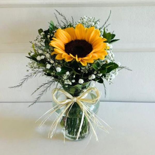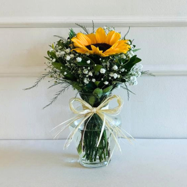 10214 – Arranjo com 1 girassol e mosquitinhos em vaso com água.