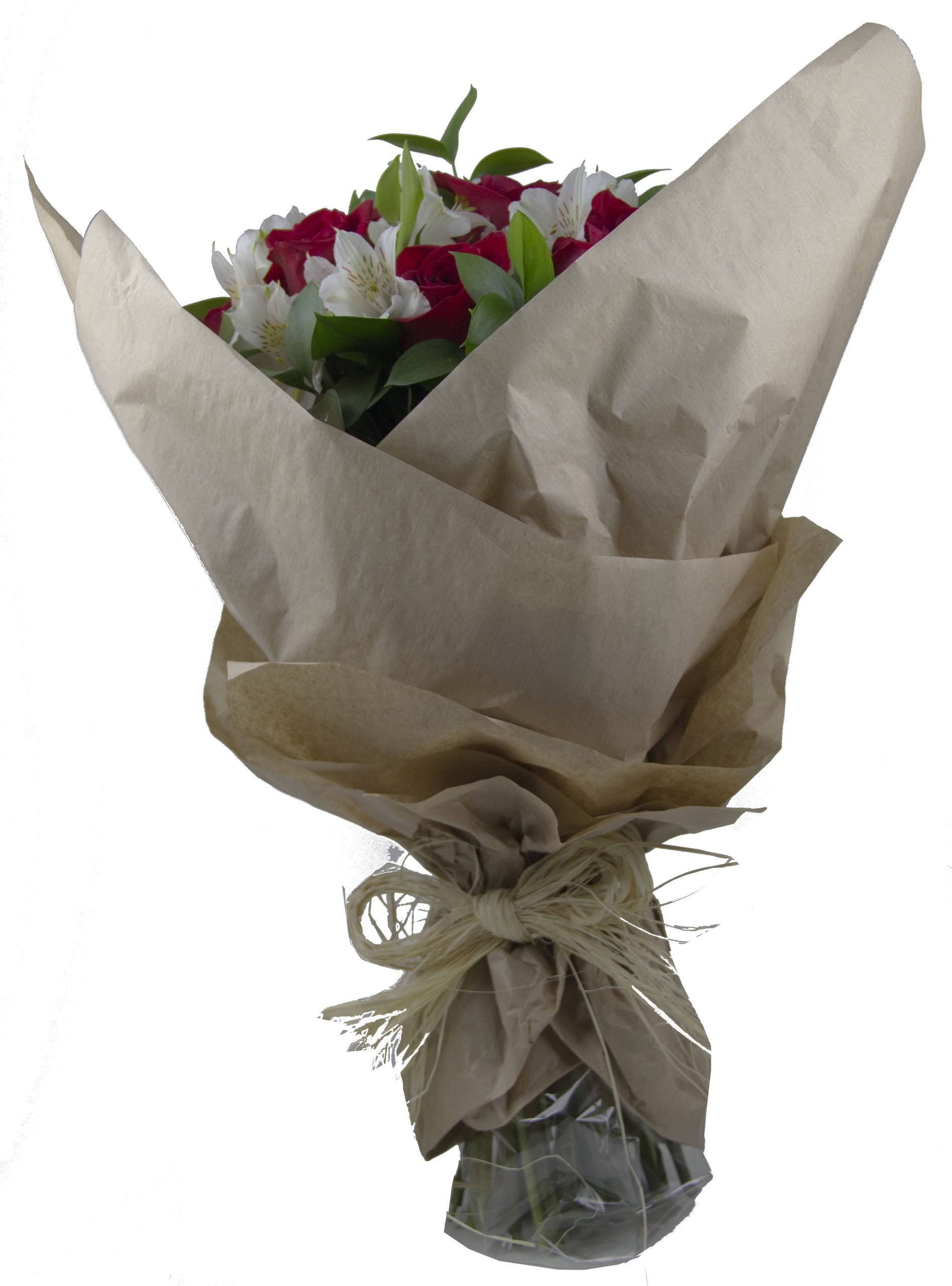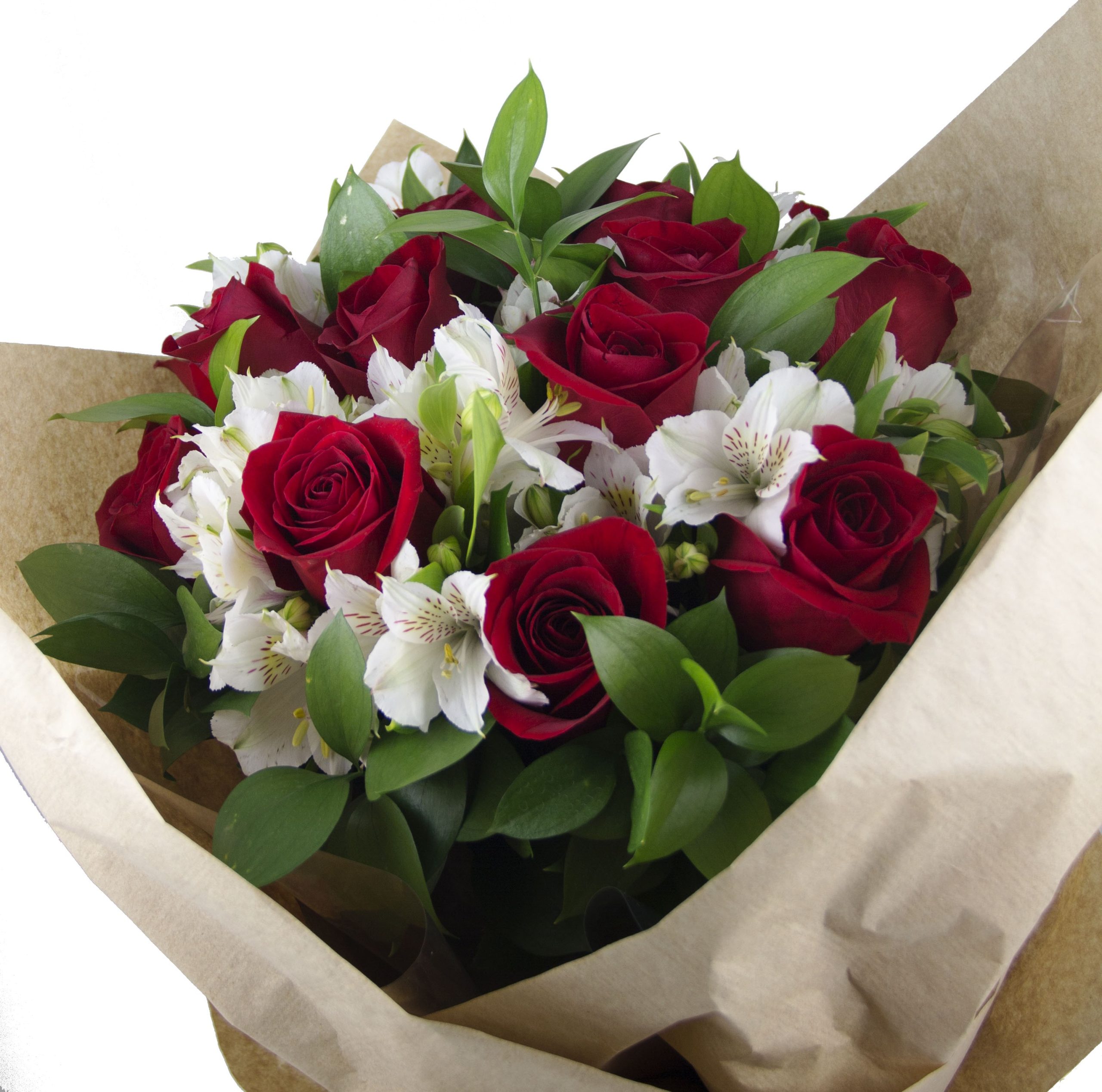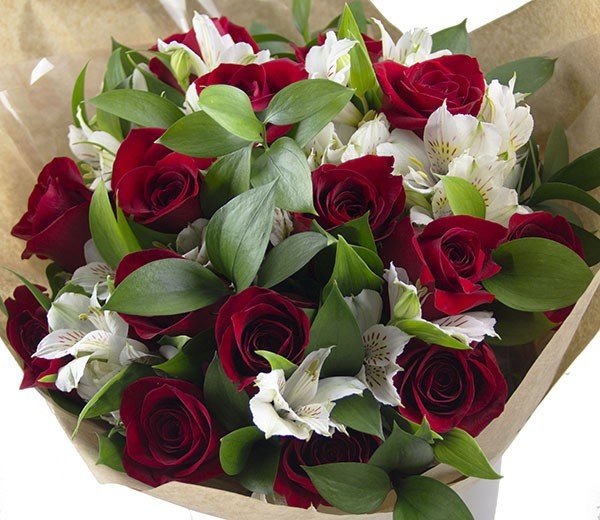 10250 – Buquê de rosas vermelhas e alstroemérias brancas, um belo contraste de cores.