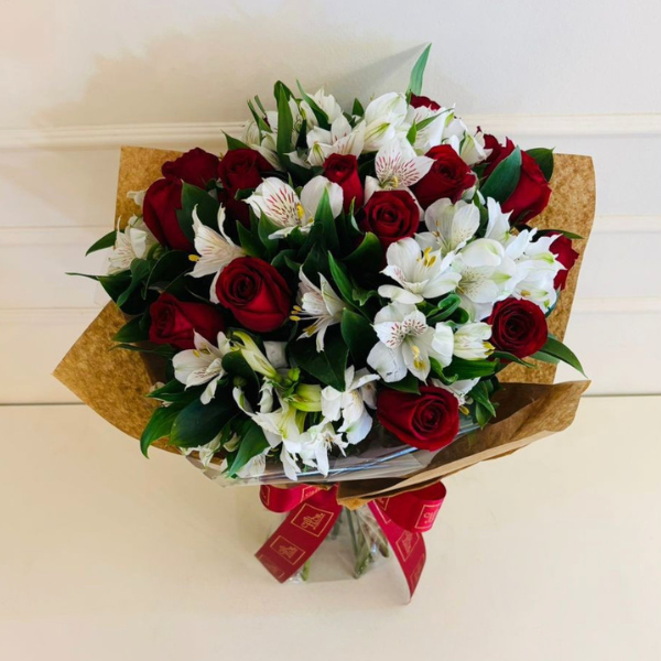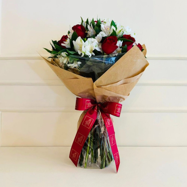 Buquê Alstroemérias Brancas e Rosas Vermelhas Kraft