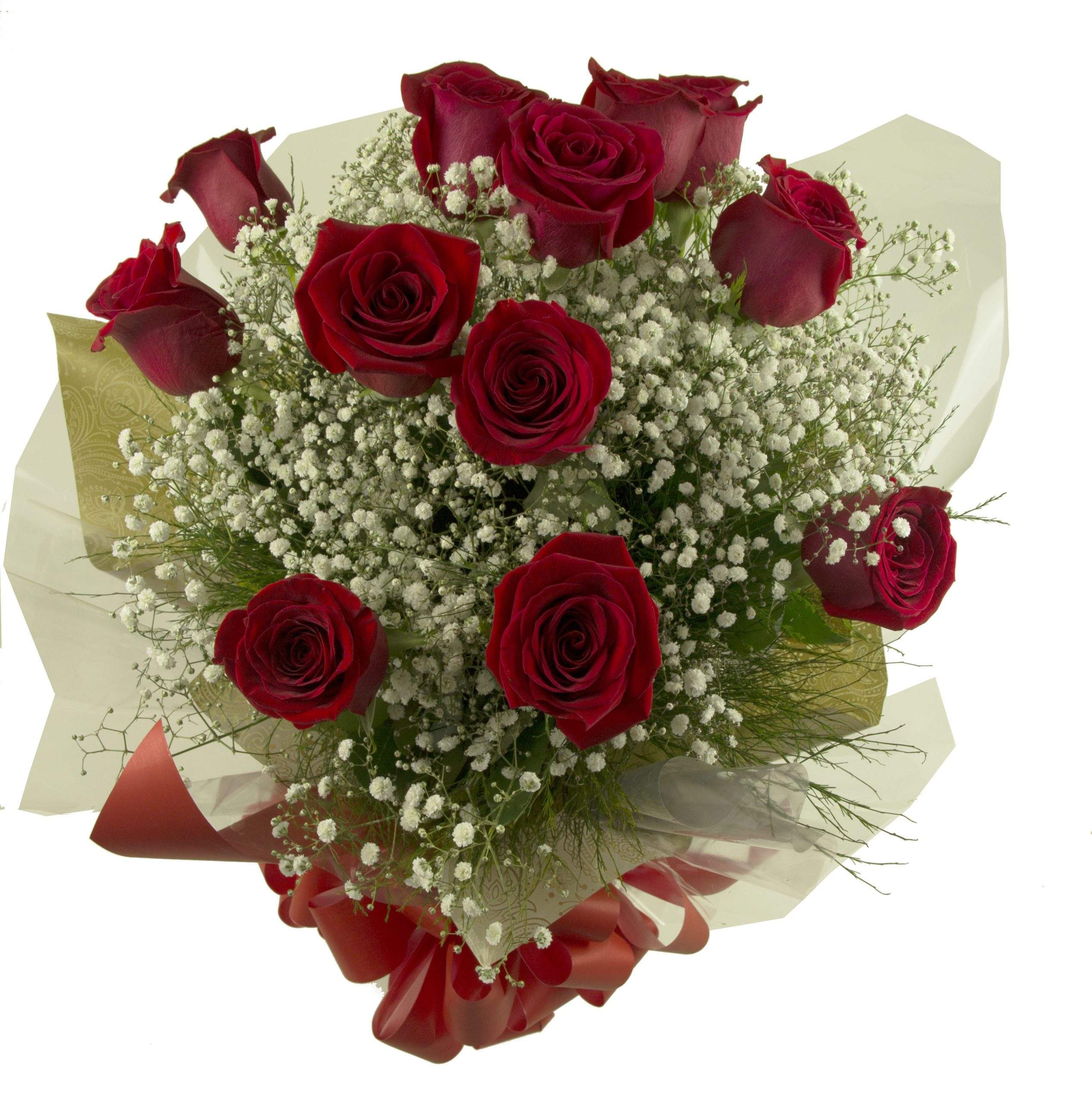 40100 – Buquê com rosas importadas vermelhas, mosquitinho e verde complementar, montado num recipiente com água, assim a pessoa a ser presenteada não necessita de um vaso.