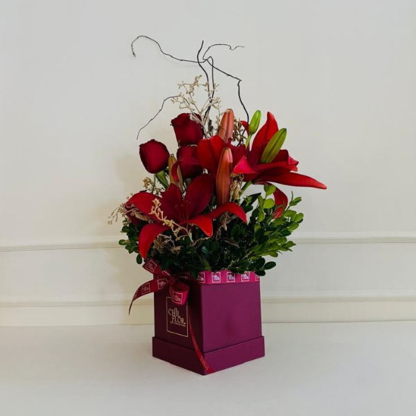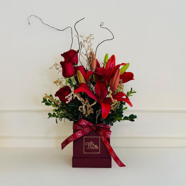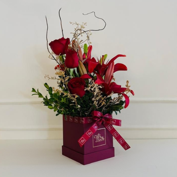 12144 – Caixa personalizada da Chilflor tamanho pequeno com lírio vermelho e rosa vermelha.