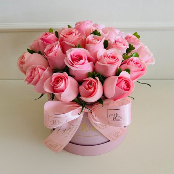 12200 – Este arranjo de rosas cor-de-rosa é moderno e elegante, em caixa personalizada da Chilflor.
