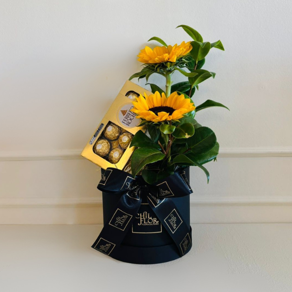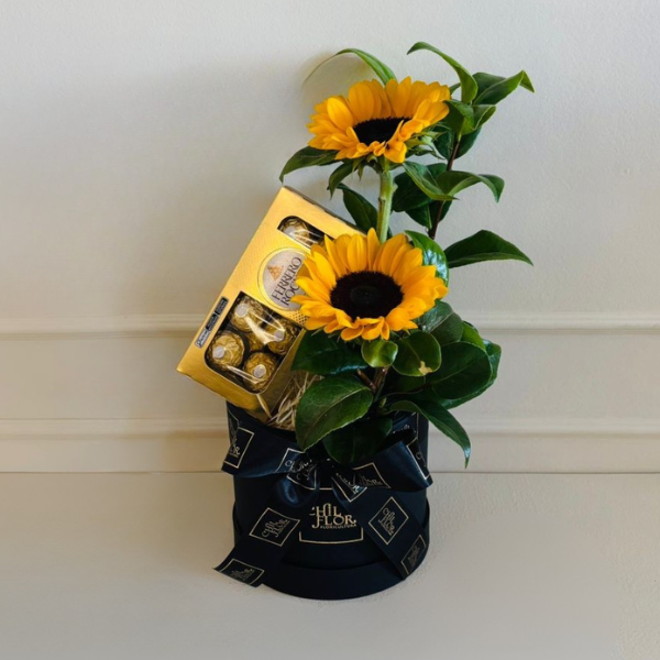 10473 – Arranjo de girassóis na caixa personalizada Chilflor e chocolate Ferrero 100g.