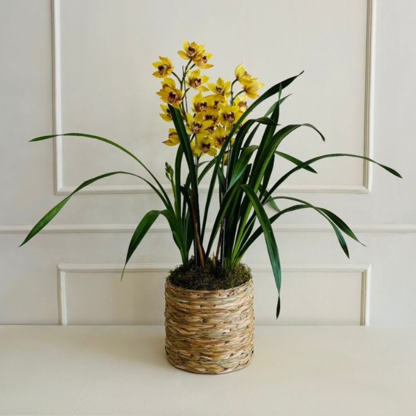 15763 – Vaso de orquídea cymbidium em cachepô de taboa.