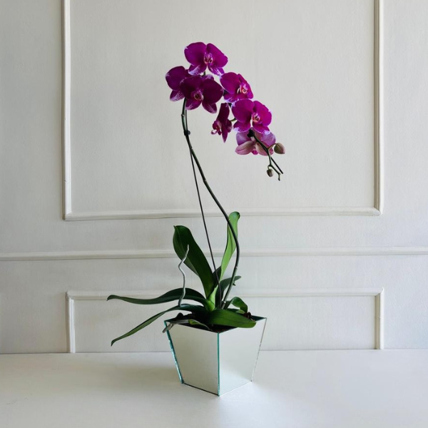 10934 – Orquídea Phalaenopsis Especial um cachepô de vidro espelhado.