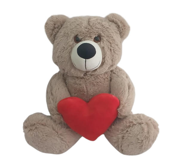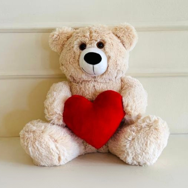 150069 – Urso Fofinho nas cores areia ou bege segurando um coração (20cm de altura, 16cm de comprimento).